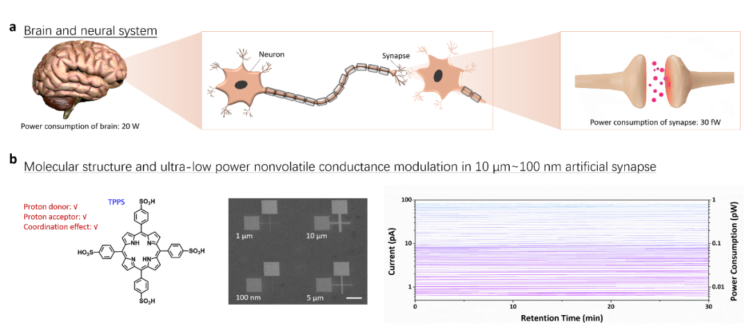 (a)人脑和(b)超低功耗神经形态分子、器件及其电导调控示意图