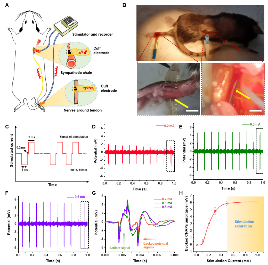 动物实验中,团队在小鼠的腰部交感神经节和腿部肌腱组织周围包裹研制的超薄卡夫电极,分别进行电刺激和电记录,结果发现电刺激交感神经时,肌腱周围可以明显记录到与刺激响应的动作电位,且随着刺激电流的加大,响应动作电位也越大,以上实验现象证实刺激的方向性和有效性,为电刺激交感神经作用肌腱组织提供经验数据。