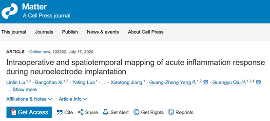 近日,上海交通大学生物医学工程学院医疗机器人研究院邱广宇、杨广中团队在脑机接口术中急性炎症反应动态检测领域取得进展,相关成果以“Intraoperative and Spatiotemporal Mapping of Acute Inflammation Response During Neuroelectrode Implantation”(脑机接口神经电极植入术中脑区急性炎症反应的时空动态检测)为题在国际著名期刊《Matter》上发表。