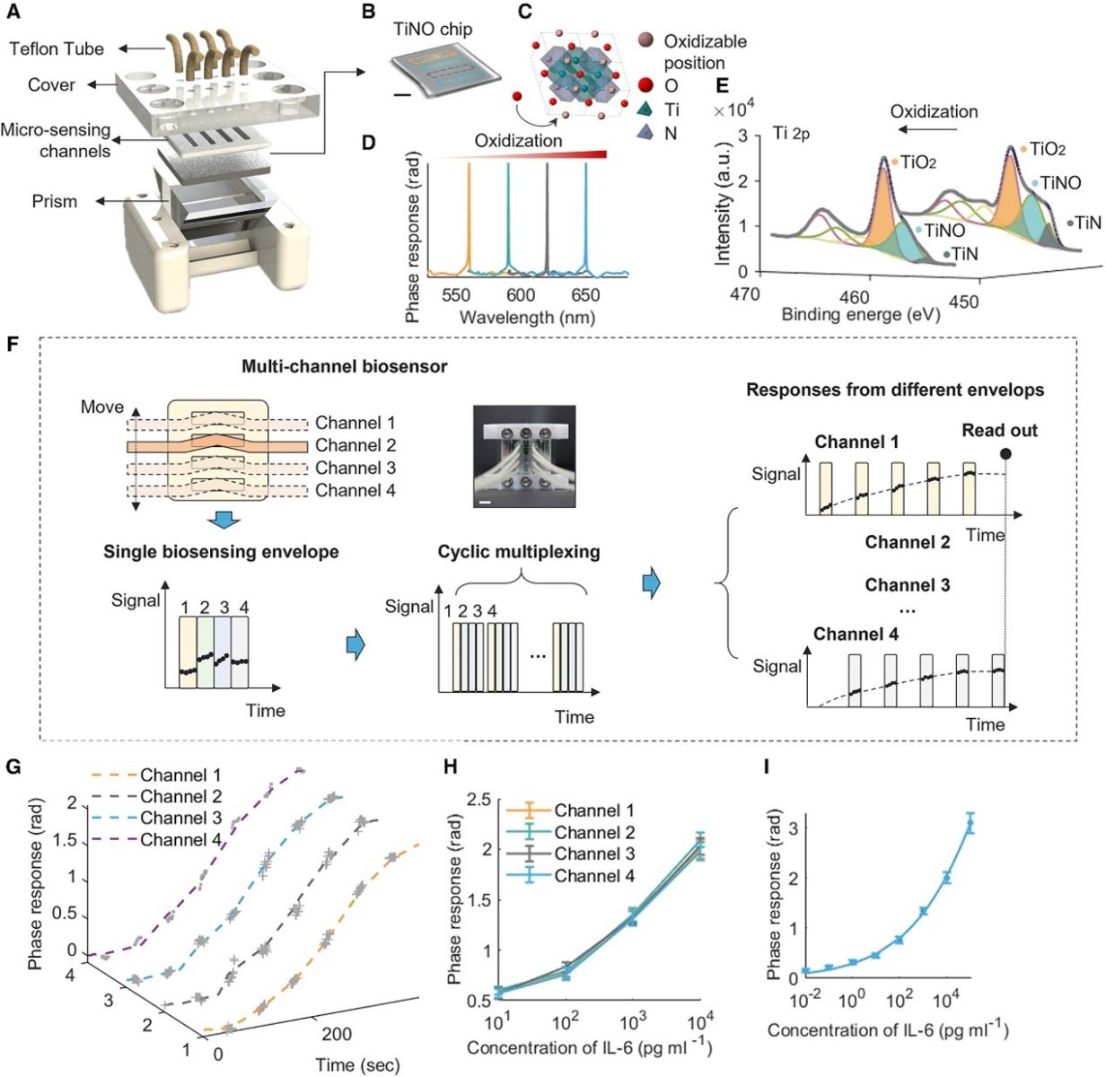 图1 用于快速定量分析炎症细胞因子的ISAID系统TiNO等离子体多路生物传感器