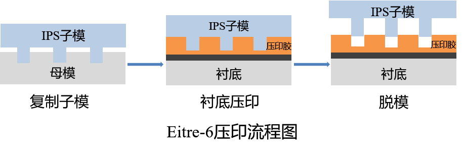 纳米压印技术通过模具和压印胶的直接接触将纳米尺寸的图形转移到涂有压印胶的晶圆上,使用紫外光或者高温将压印胶固化后进行脱模。Eitre-6纳米压印机采用气体软压技术,有力保证了压印的均匀性与一致性,减少碎片的发生。中间聚合物(IPS)转印可以最大程度保护原始模具,延长模具使用寿命。设备及压印流程如下图所示: