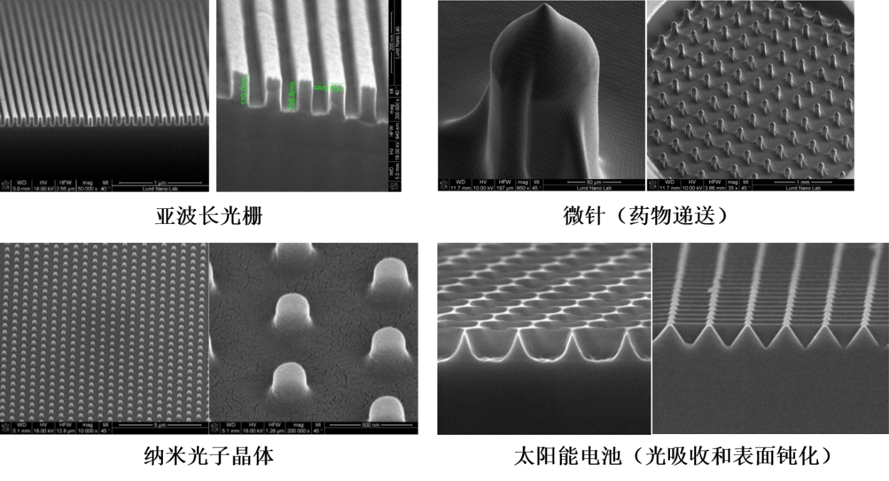 纳米压印可用于制备纳米光子晶体、亚波长光栅结构、太阳能电池、有机发光二极管(OLED)以及生物微沟道等: