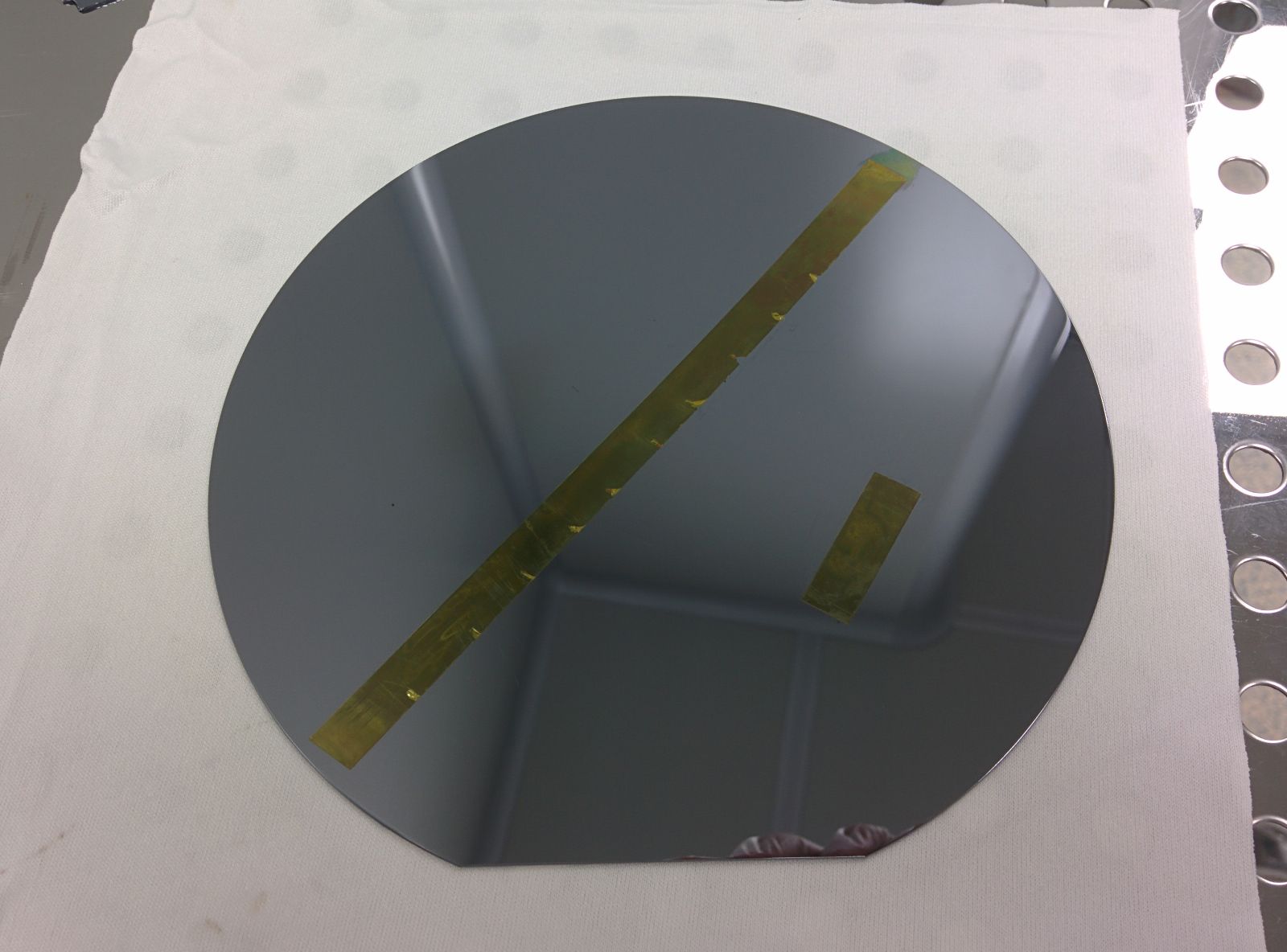 此为涂布了光刻胶的6寸硅片,为方便观察,用高温胶带进行了标记;