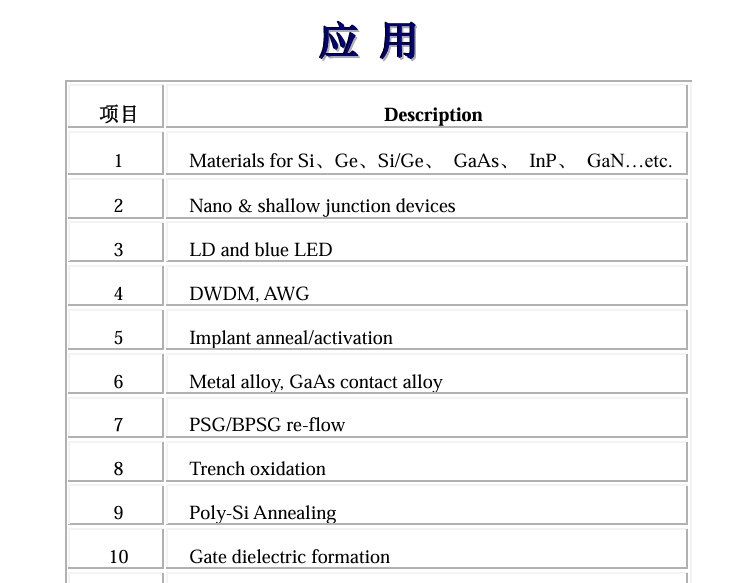 此设备用于样品的快速热退火工艺,可以实现300~1100度之间的热退火, 可以用于离子注入后的激活工艺,也可以用于各种材料的热退火,损伤修复等工艺。 此设备还配备真空泵,可以实现腔体抽真空,有效防止样品被氧化等。